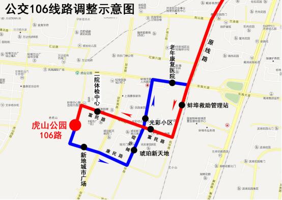 線路調(diào)整后原106路“光彩小區(qū)”站改為“蚌埠救助管理站”、原“富民路•富華路”站改為“光彩小區(qū)”站;同時在富民路上增設(shè)“二院體檢中心”、康民路上增設(shè)“新地城市廣場”、富華路上增設(shè)“琥珀新天地”站。