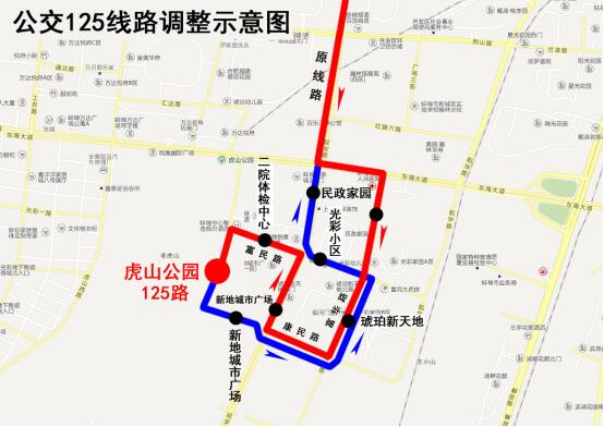 線路調(diào)整后原125路“老年康復(fù)醫(yī)院”、“光彩小區(qū)終點(diǎn)站”將不再???25路;同時在富華路上增設(shè)“光彩小區(qū)(下客站)”、“琥珀新天地”站;富民路上增設(shè)“光彩小區(qū)(上客站)”、“二院體檢中心(下客站)”站;康民路上增設(shè)“新地城市廣場(上客站)”站。