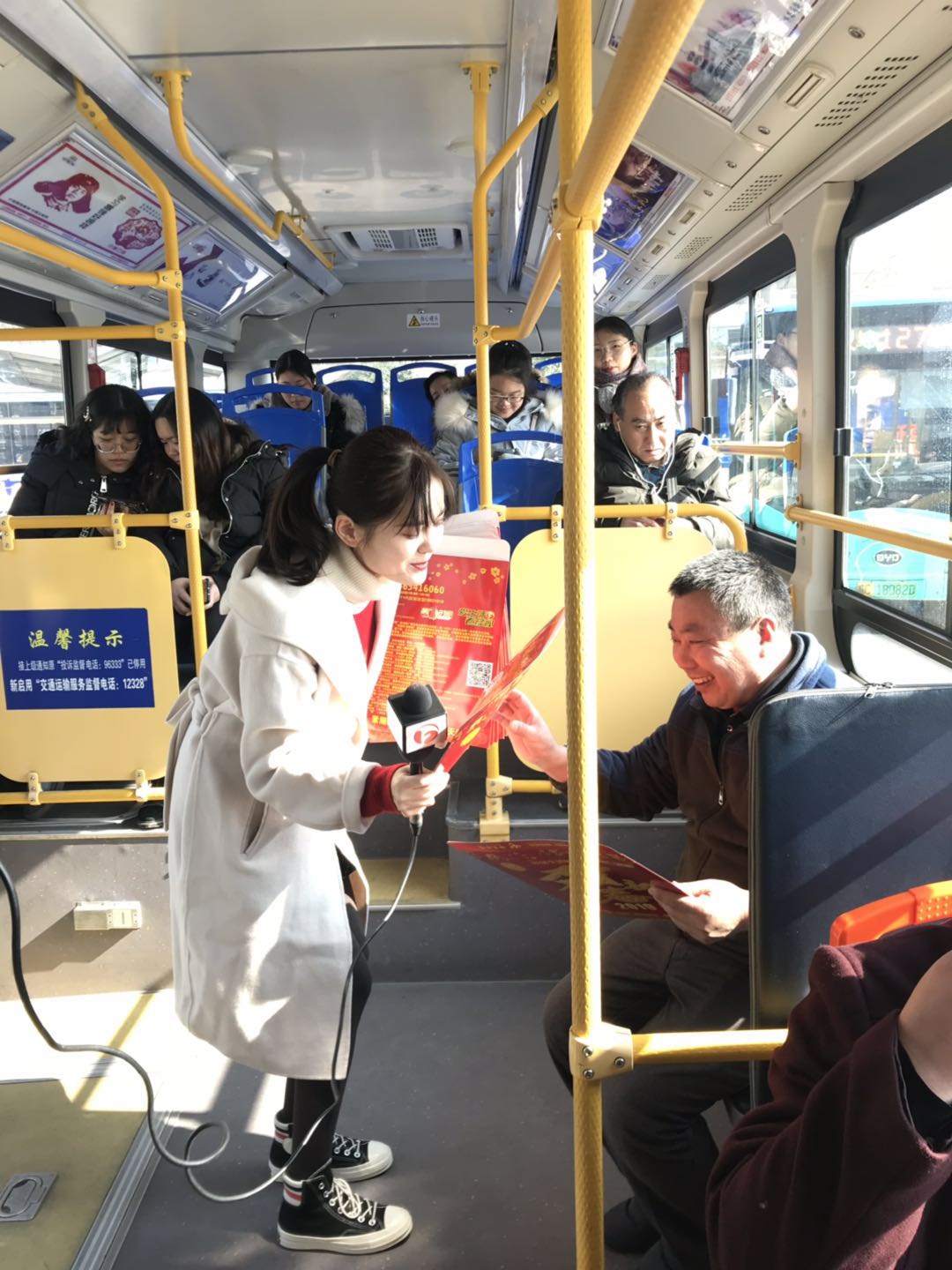 1月23日上午,安徽電視臺“第一時間”欄目組來到蚌埠市高鐵南站公交樞紐站開展“迎豬年,送春聯”活動。欄目組看望慰問了一線公交駕駛員,并給他們送上春聯,向他們道一聲新春祝福,感謝他們為市民出行提供了便捷保障,駕駛員對于欄目組的到來感到非常意外,也很驚喜。隨后,欄目組還為乘坐公交車的市民送上了春聯。