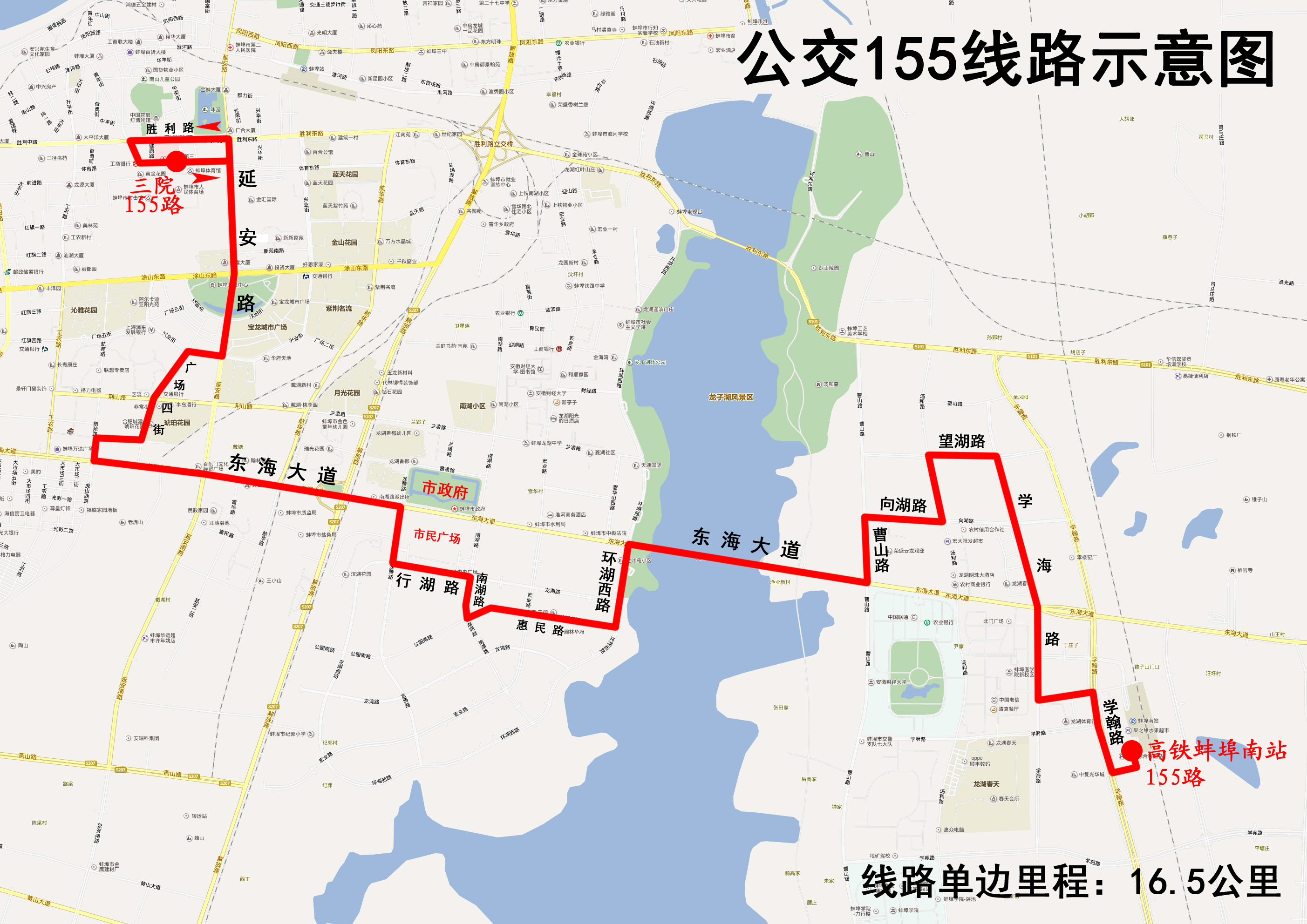 為更好的服務蚌埠高鐵南站、濱湖新區、銀泰萬達商業區、淮河文化廣場以及第三人民醫院等區域周市民乘公交出行,公交集團擬于2019年3月1日起,開行第三人民醫院至高鐵蚌埠南站的公交線路,線路號擬定為“155”路。線路具體走向、??空军c、線路長度以及營運時間如下: