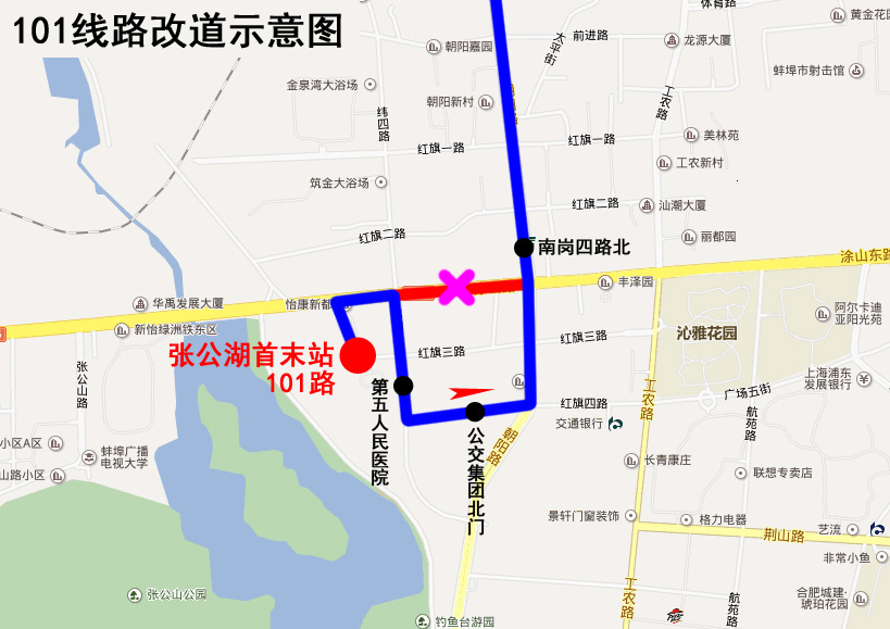 101線路張公湖至肉聯(lián)廠走向由原線路“張公湖—涂山路—朝陽路(南崗四路)......肉聯(lián)廠”調整為“張公湖—涂山路—緯四路—紅旗四路—朝陽路(南崗四路北)......肉聯(lián)廠”。線路調整后,增設“第五人民醫(yī)院”、“公交集團北門”停靠站。