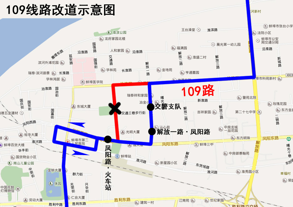因交通路(鳳陽(yáng)路至圈堤路)封閉施工,2019年4月13日起,公交109路來(lái)回雙向改道為:原線路—鳳陽(yáng)路—解放一路—治淮路—原線路。
