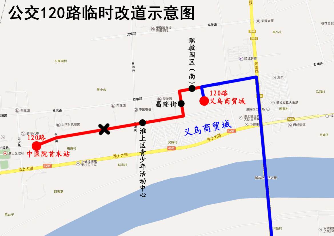 改道期間公交車將取消停靠“中醫院首末站”、“淮上區青少年活動中心”、“昌隆街”、“職教園區(南)”站。封閉施工結束后恢復原線。
