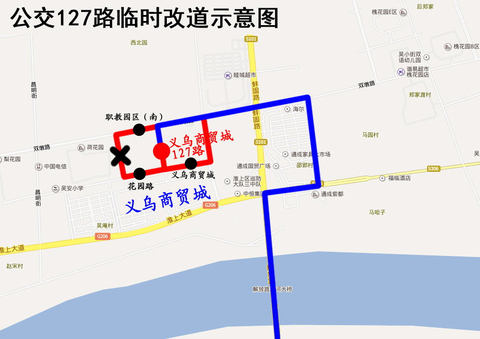 127路公交車臨時改道公告 因花園路(永平街至昌平街)封閉施工,2019年4月18日起,公交127路來回雙向改道為:原線路—雙墩路—馬園路—原線路。高鐵南站至義烏商貿城方向保持不變。 改道期間公交車將取消???ldquo;職教園區(南)”、“花園路”、“義烏商貿城(花園路上客站)”站。封閉施工結束后恢復原線。