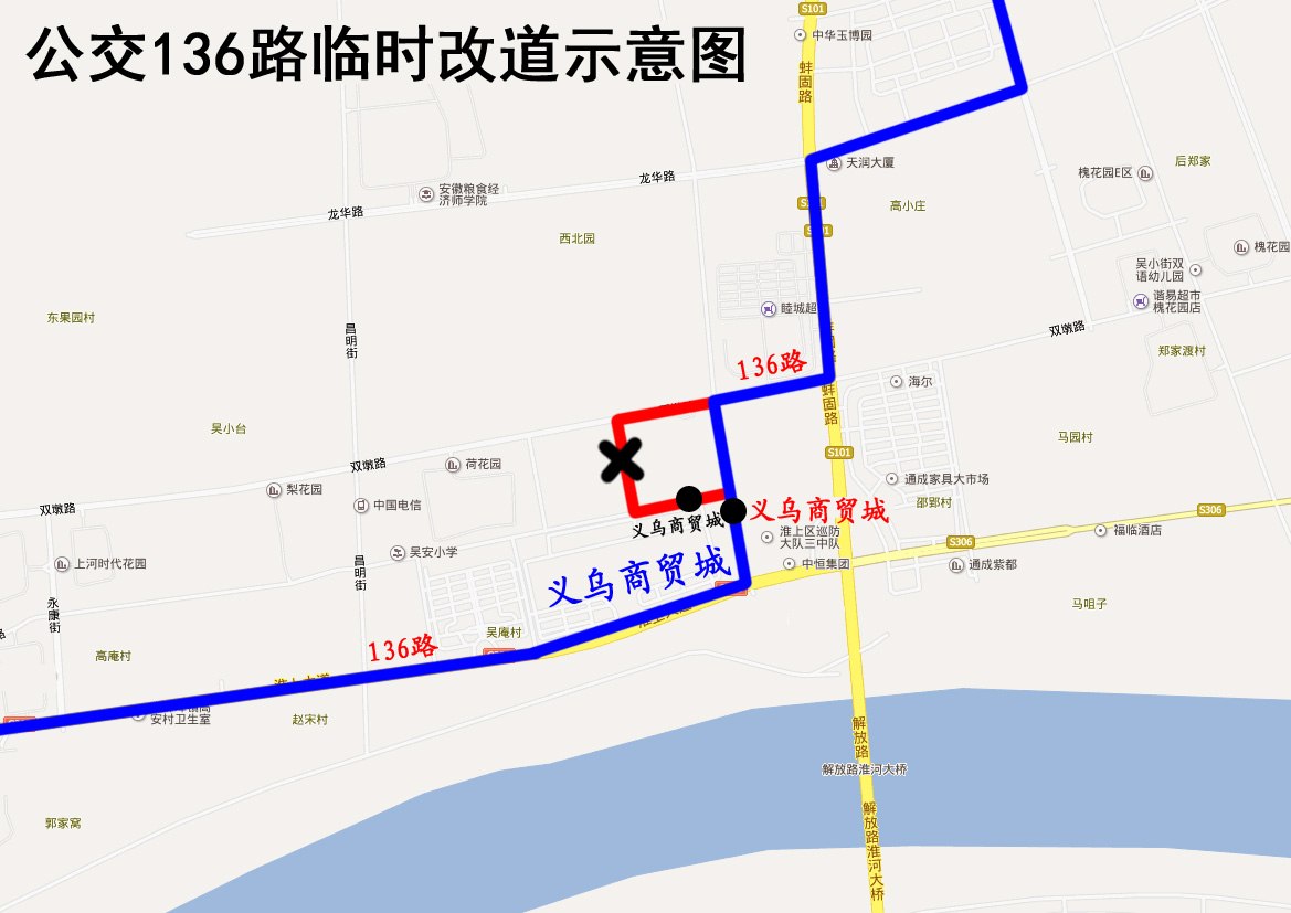 因花園路(永平街至昌平街)封閉施工,2019年4月18日起,公交136路合一冷鮮城首末站至客運南站方向改道為:原線路—解放路—雙墩路—昌平街—淮上大道—原線路。客運南站至合一冷鮮城首末站方向保持不變。