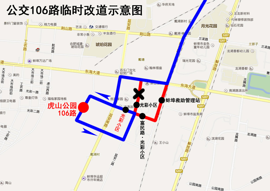 改道期間公交車將取消停靠“蚌埠救助管理站”、“富民路•光彩小區(富華路東側站)”、“富華路•光彩小區”站。臨時停靠“富民路•光彩小區(富華路西側站與125路并站)”站,封閉施工結束后恢復原線。