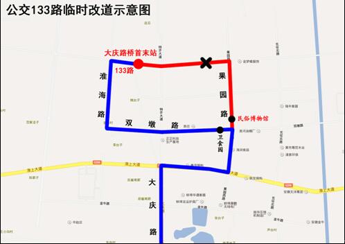 因大慶北路與龍華路交口封閉施工,自2020年3月30日起,公交133路部分走向由:“大慶路橋首末站—龍華路—果園路—淮上大道—原線路”調(diào)整為“大慶路橋首末站—龍華路—淮海路—雙墩路—果園路—淮上大道—原線路”。
