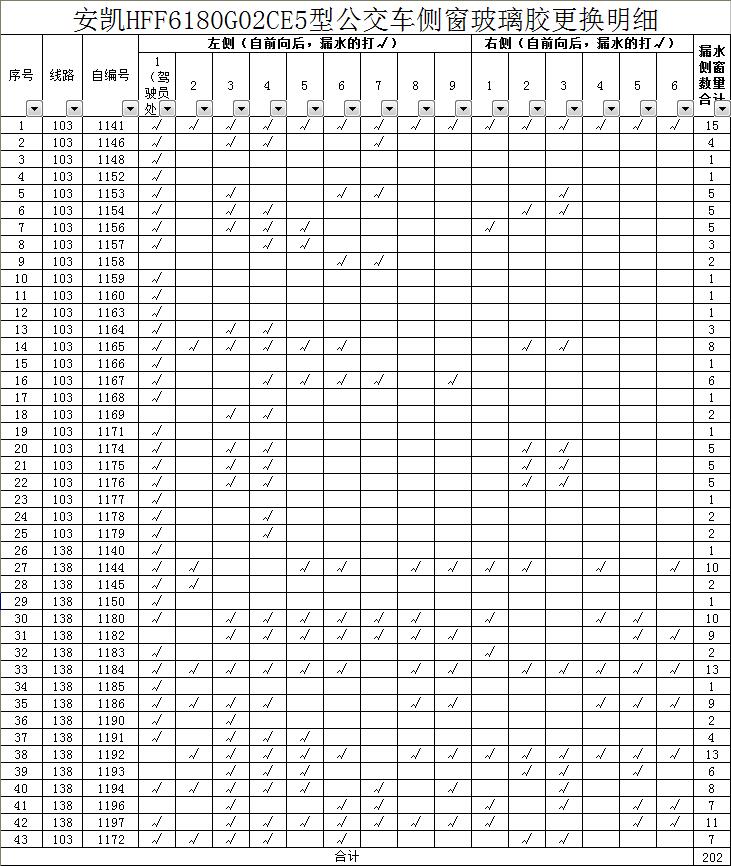 (三)項目內容:安凱牌HFF6140G06CE5及HFF6180G02CE5型84臺公交車共575個側窗玻璃膠更換服務。(具體車輛編號及需更換的側窗玻璃膠明細見附表1);